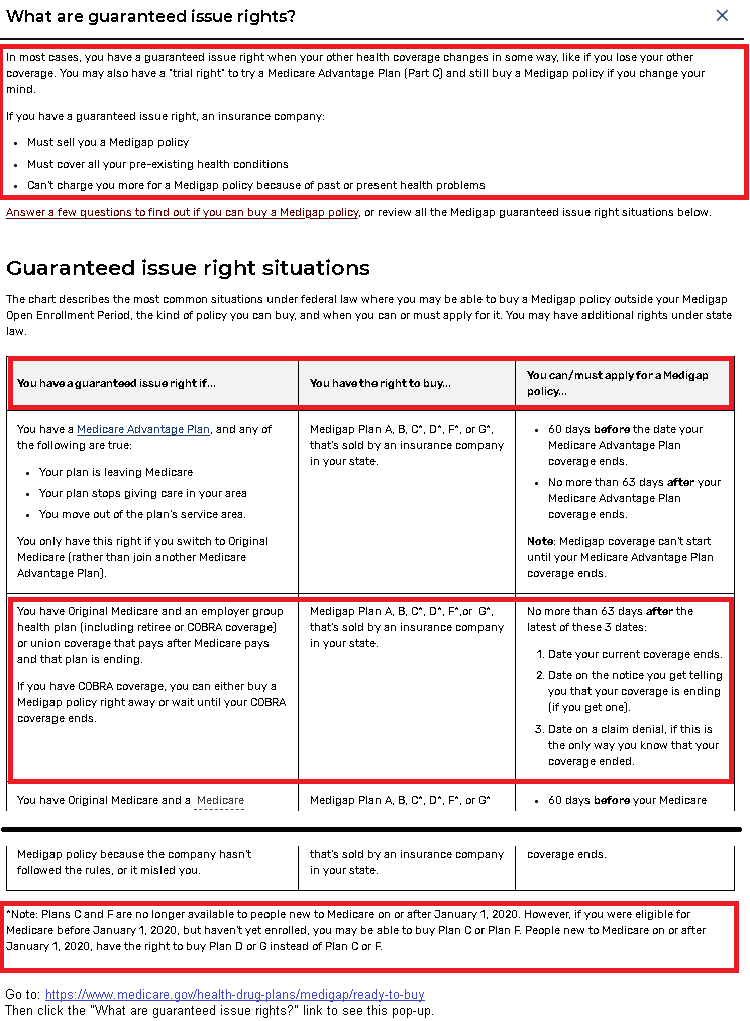 https://www.hpalumni.org/escalate-ARHS ) Here are the rules on the official Medicare site. Go to: https://www.medicare.gov/health-drug-plans/medigap/ready-to-buy Then click the "What are guaranteed issue rights?" link to see this pop-up: https://www.hpalumni.org/Medicare-GuaranteedIssue.png