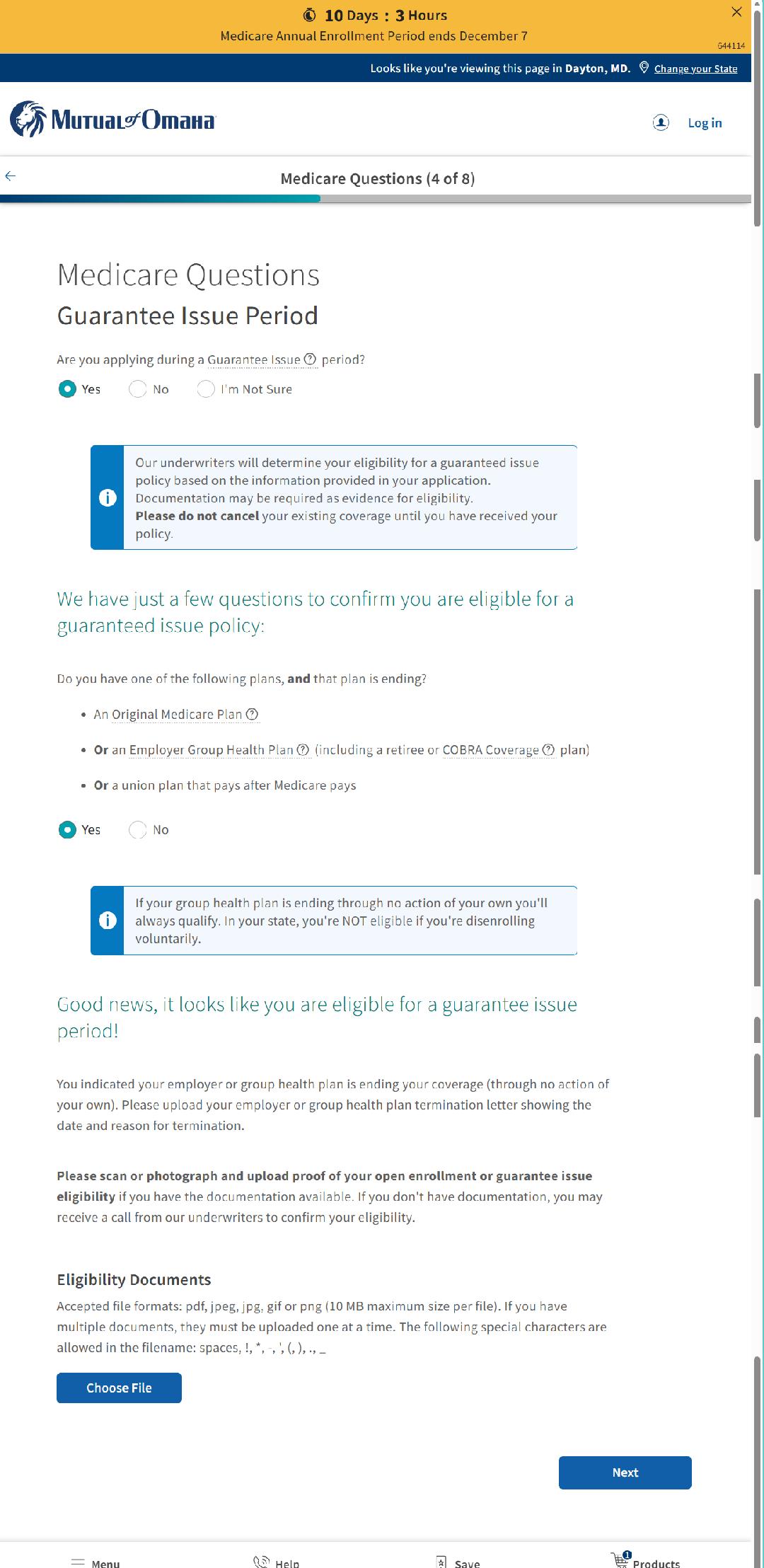 Examples for specific insurers. UHC: The wording of the loss-of-coverage letter from UnitedHealthcare is rather abrupt, but is carefully worded in Medicare language: "We’re writing to let you know that HP chose to end your medical and prescription drug coverage because you no longer meet the eligibility requirements." Members report that if your existing group policy is at UHC -- and you are purchasing an individual open-market policy from UHC -- you do not need to forward the letter from UHC about your disenrollment from the UHC group plan. Apparently UHC's system is smart enough to deal with that. Mutual Of Omaha: The application process on the MoO site displays this page: https://www.hpalumni.org/MoO-GuaranteedIssue.png The page asks "Are you applying during a Guarantee Issue Period?" If you check "Yes" -- it asks: "Do you have one of the following plans, and that plan is ending? ...an employer Group Health Plan (including a retiree or COBRA Coverage plan)..." If you check "Yes"-- it says: "If your group health plan is ending through no action of your own you'll always qualify. In your state, you're NOT eligible if you're disenrolling voluntarily." and "Good news, it looks like you are eligible for a guarantee issue period!" and then gives instructions on how to upload your documentation.